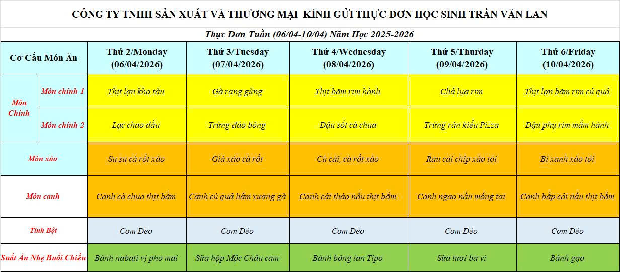 THỰC ĐƠN HỌC SINH TUẦN TỪ 06/04-10/04/2026