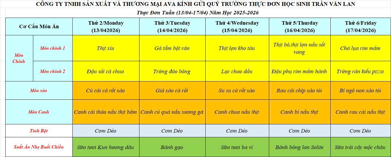 THỰC ĐƠN HỌC SINH TUẦN TỪ 13/4-17/04/2026
